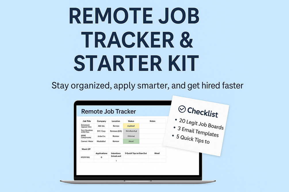 A job tracker + starter kit to help you stay organized, apply faster, and land remote jobs. Includes templates, job boards, and a bonus checklist.